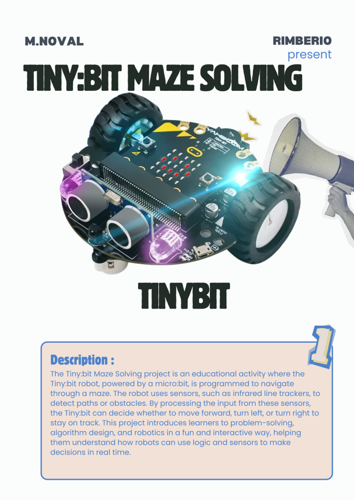 The Tiny:bit Maze Solving project is an educational activity where the Tiny:bit robot, powered by a micro:bit, is programmed to navigate through a maze. The robot uses sensors, such as infrared line trackers, to detect paths or obstacles. By processing the input from these sensors, the Tiny:bit can decide whether to move forward, turn left, or turn right to stay on track. This project introduces learners to problem-solving, algorithm design, and robotics in a fun and interactive way, helping them understand how robots can use logic and sensors to make decisions in real time.